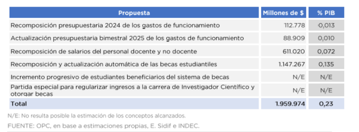 Se estimó que lo solicitado presupuestariamente para el año 2025, según el expediente CD-7/2025 (Ley de Financiamiento Universitario y recomposición salarial) tendrá un impacto de $1.959.947 millones, equivalente al 0,23% del PIB.