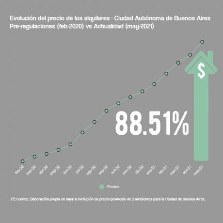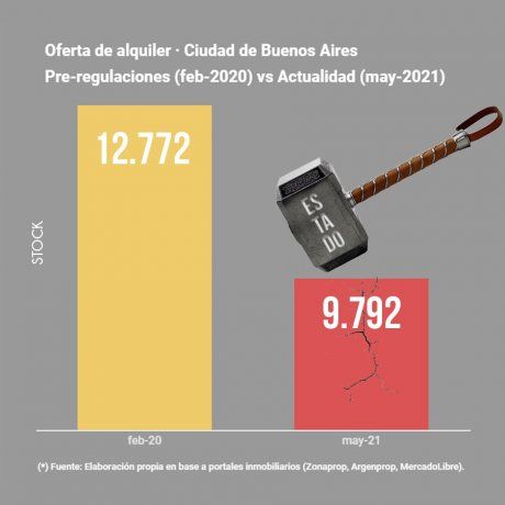 El martillo de las regulaciones estatales no ha generado más que efectos adversos: si comparamos la disponibilidad de unidades en alquiler en la actualidad (mayo 2021) con la oferta existente previo al intervencionismo (febrero 2020), el stock registra una caída del 23,33% en la Ciudad de Buenos Aires. Por su parte, en el mismo período, los precios aumentaron 88,51%.