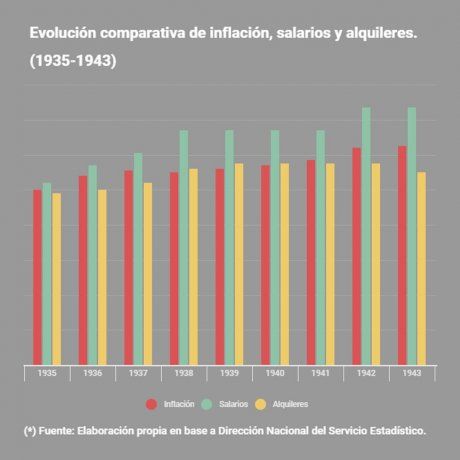 A continuación, centraremos nuestro análisis en el novenio precedente a la norma (1935-1943). Para la serie, tomaremos tres variables a comparar: inflación, salarios y alquileres.