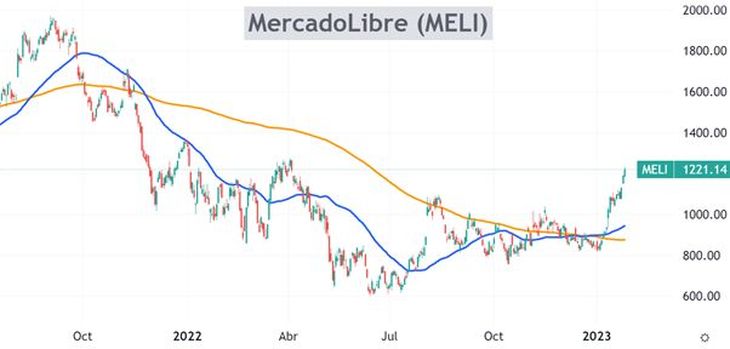 Las acciones de MercadoLibre aún se encuentran 38% por debajo de los máximos de 2021, pero han tenido una fuerte recuperación desde los mínimos. En el gráfico, además del precio hay dos líneas: la azul (media móvil de 50 días) y la naranja (media móvil de 200 días).