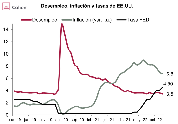 Respecto a esto último, podemos dividir al 2022 en dos etapas: la primera, que duró hasta junio, en la que los precios de la energía aceleraron la marcha que la inflación venía teniendo desde 2021 (pasó de 0,6% mensual a 0,9% mensual); y la segunda, a partir de la segunda mitad de año, cuando la inflación bajó al 0,2% mensual gracias a la caída de los precios energéticos. La mala noticia es que la inflación Core –excluye energía y alimentos– muestra una mayor resistencia a la baja dada la menor flexibilidad de los precios de los servicios, por lo que mantiene un alza en torno al 0,4% mensual. Así las cosas, si bien la inflación comenzó a ceder, aún está muy por encima al objetivo de 2% anual de la Fed, lo que la obliga a mantener el sesgo contractivo de la política monetaria.