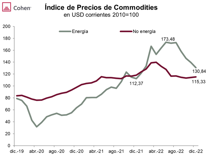 Si bien el factor común es el temor a la desaceleración/recesión global, podemos enumerar otros factores que permitieron aplacar este riesgo: en cuanto al petróleo, pese a las sanciones y el cierre del mercado europeo, Rusia pudo sustituir las exportaciones al viejo continente con más envíos a China e India al tiempo que EE.UU. utilizó inventarios estratégicos para aumentar la oferta; en el caso del gas natural, Europa pudo abastecerse de otros proveedores y acumuló buena cantidad de inventario para pasar el invierno; en cuanto a los precios agrícolas, la gradual normalización de los envíos de Ucrania de trigo y maíz quitó presión a los precios que también terminaron el año en los niveles de principio de año. La soja marcó una tendencia similar, aunque logró terminar el año por encima de lo que lo había empezado.