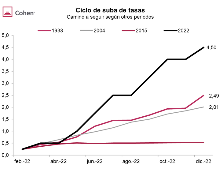 Con la inflación lanzada, en cada una de las siguientes 6 reuniones que siguieron subió la tasa hasta cerrar el año en 4,50%. Es el ajuste monetario más rápido y contundente de las últimas 4 décadas: en el ciclo contractivo anterior de 2015, la suba de tasas pasados 10 meses fue de apenas 25 pb, y superó también ampliamente al de 1994, cuando la suba de tasas fue de 175 pb en el mismo período.