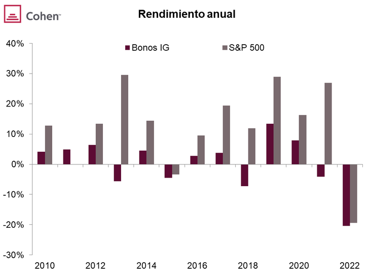 Como comentamos, en 2022 los mercados tuvieron un año tristemente olvidable. Tomando como referencia los índices más representativos, en renta variable el S&P cayó 20% en el año y prácticamente idéntica performance tuvo el índice de bonos de alta calidad. El mayor ajuste se dio en los primeros meses del año, en los que las acciones cayeron 25% y los bonos 23%, mientras que en el último trimestre, con un mercado que fue digiriendo el shock de suba de tasas, las acciones repuntaron 7% y los bonos 2%.