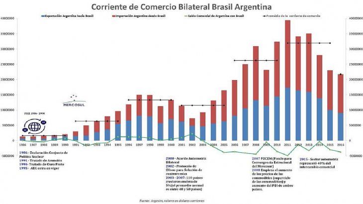 Entre 1985 y 2003 el comercio entre Argentina y Brasil resulta equilibrado, con un saldo acumulado de unos pocos miles de millones de dólares a nuestro favor. Desde 2003 hasta ahora acumulamos un déficit comercial de unos USD 52.000 millones con Brasil. En el mismo período las importaciones brasileñas crecieron 300%.