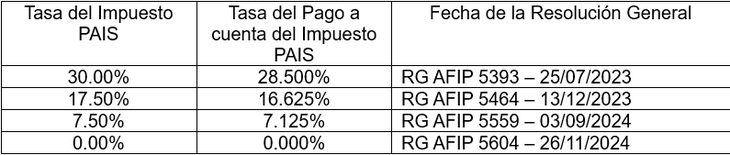 A modo de repaso, recordamos cómo han evolucionado las tasas aplicables al pago a cuenta, equivalente al 95% de la alícuota del Impuesto PAIS, conforme a lo dispuesto en las distintas Resoluciones Generales publicadas por el fisco argentino.