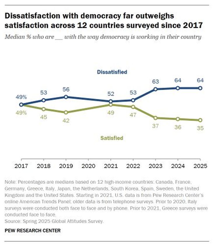 Esto tiene que ver con que la democracia no ha dado respuestas a las necesidades de la gente y así hoy casi dos de cada tres personas se muestran insatisfecha con ella (6).