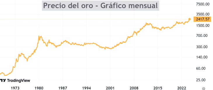 Desde el último mínimo, marcado en noviembre de 2022, el oro ha subido un 48%. ¿Entonces ya subió mucho? No me atrevería a decirlo. ¿Por qué? Entre 1972 y 1980, el precio del oro aumentó más del 1500%. De 1982 a 1985, subió un 82%. Entre 2000 y 2008, su valor se cuadruplicó. En 2015, comenzó un rally del 100% que alcanzó su pico en 2020. Invertir en oro en determinados momentos ha sido muy redituable.