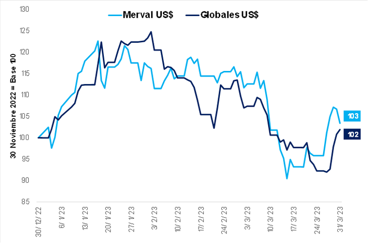 Sin embargo, aunque en temporalidades diferentes, y con ayuda del extranjero, el humor cambió. El primero en reaccionar fue el Merval, que se desacopló de los Globales el 16 de marzo, comenzando su recuperación. El 29 de marzo lo siguieron los bonos soberanos saltando US$1,45 en una jornada, achicando la brecha con el índice bursátil. De esta forma, para cierre de marzo ambos se hallaban en terreno de ganancias respecto de 2022.