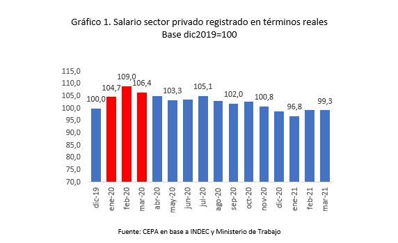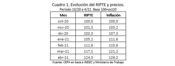 ¿Qué pasó con los salarios en este contexto? Corrieron de atrás. Se observa que el salario privado registrado se mueve a valores similares a la inflación, pero evidenciando una demora de un mes. Puesto de otro modo, si en noviembre la inflación fue de 3,2%, al salario le llevó hasta diciembre para llegar al 3,3%. El mismo patrón se replica en enero: la inflación acumulada asciende a 11,6% (desde octubre 2020) y los salarios alcanzan ese valor recién en febrero de 2021. Sólo en marzo y abril se observa una leve baja del diferencial.