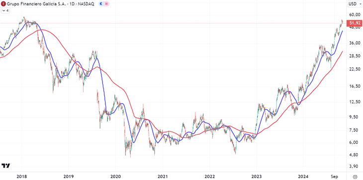 Ejemplo: gráfico diario de Banco Galicia, con medias móviles de 50 y 100 períodos.