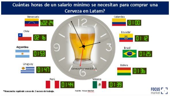 Para el caso de la compra de una Cerveza en Venezuela se requieren 602 horas y 24 minutos, en Chile 2 horas 16 minutos, en Argentina 1 hora 53 minutos mientras en el otro extremo en Ecuador se requieren 1 horas 12 minutos y en Colombia 1 hora.