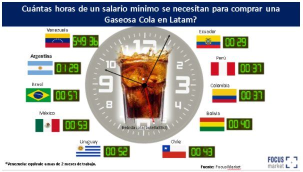 Para el caso de la compra de una Gaseosa Cola en Venezuela se requieren 549 horas y 36 minutos, en Argentina 1 hora 29 minutos mientras en el otro extremo en Perú se requiere 37 minutos y en Ecuador 29 minutos.
