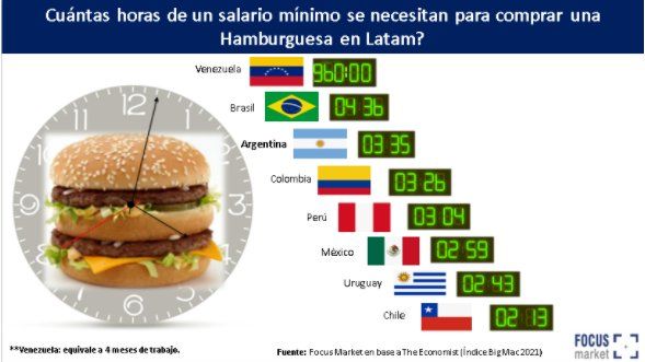 Para el caso de la compra de una hamburguesa en Venezuela se requieren 960 horas de trabajo medidos en su salario mínimo vital y móvil, en Argentina 4 horas 36 minutos mientras en el otro extremo en Uruguay se requieren 2 horas 43 minutos y en Chile 2 horas 13 minutos.