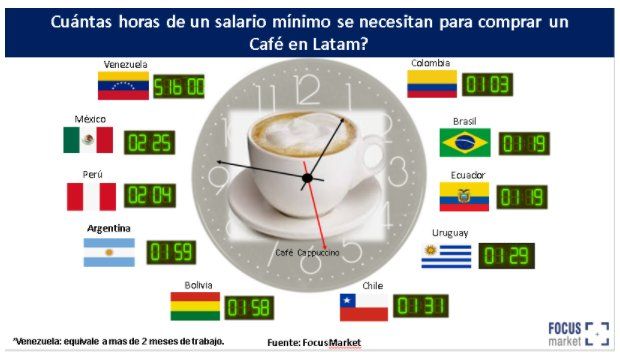 Para el caso de la compra de un Café en Venezuela se requieren 516 horas, en México 2 horas 25 minutos, en Perú 2 horas 4 minutos mientras en el otro extremo en Brasil se requieren 1 horas 19 minutos y en Colombia 1 hora y 3 minutos ambos países con producción local de café.