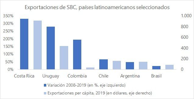 Sin embargo, al comparar el desempeño con el resto del mundo los resultados son menos alentadores. Entre 2008 y 2019, las exportaciones argentinas de SBC crecieron 49%, a menor ritmo que el total mundial (82%) e incluso que América Latina (62%). Durante el mismo período, las ventas externas de estos servicios aumentaron 67% en Chile, se triplicaron en Colombia y se multiplicaron aproximadamente por cuatro en Costa Rica y Uruguay.