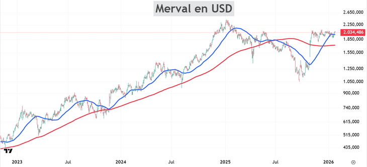 El Merval también está en clara tendencia alcista (por encima de ambas medias móviles) y tiene buenas perspectivas: