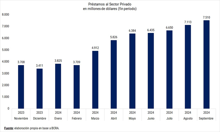 Este dato podría haber sido mucho peor sí, en lo que va del año, y, especialmente en agosto, los préstamos en dólares al sector privado no hubieran crecido USD 4.100 Millones desde diciembre de 2023 hasta el 30 de septiembre y USD 720 millones desde el 28 de agosto hasta la misma fecha.