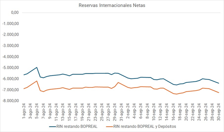 El Gobierno incumplirá en 2.000 Millones de dólares la meta de Reservas Netas acordada con el FMI para septiembre. Así las Reservas Netas terminaron septiembre en -6.393,69 millones de dólares considerando los vencimientos de BOPREAL a 12 meses, ya que son un pasivo remunerado en dólares del BCRA