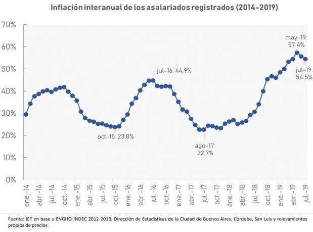 Asimismo, en los primeros siete meses del año la inflación acumuló un 25,5%, mientras que en la medición interanual de julio de 2018 a julio de 2019, los precios treparon un 54,5%.