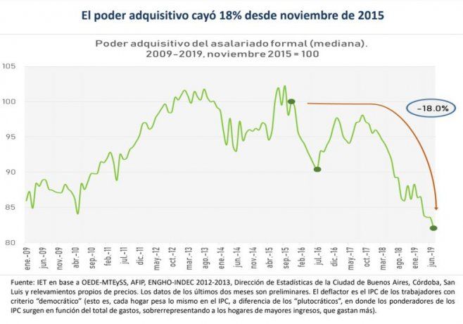 “Desde el informe que elaboramos con el IET observamos que entre noviembre de 2015 y julio de 2019, el salario real cayó 18%. Hay que remontarse a la crisis de 2002 para encontrar una caída superior en magnitud a la registrada en los últimos años”, concluyó Santa María.