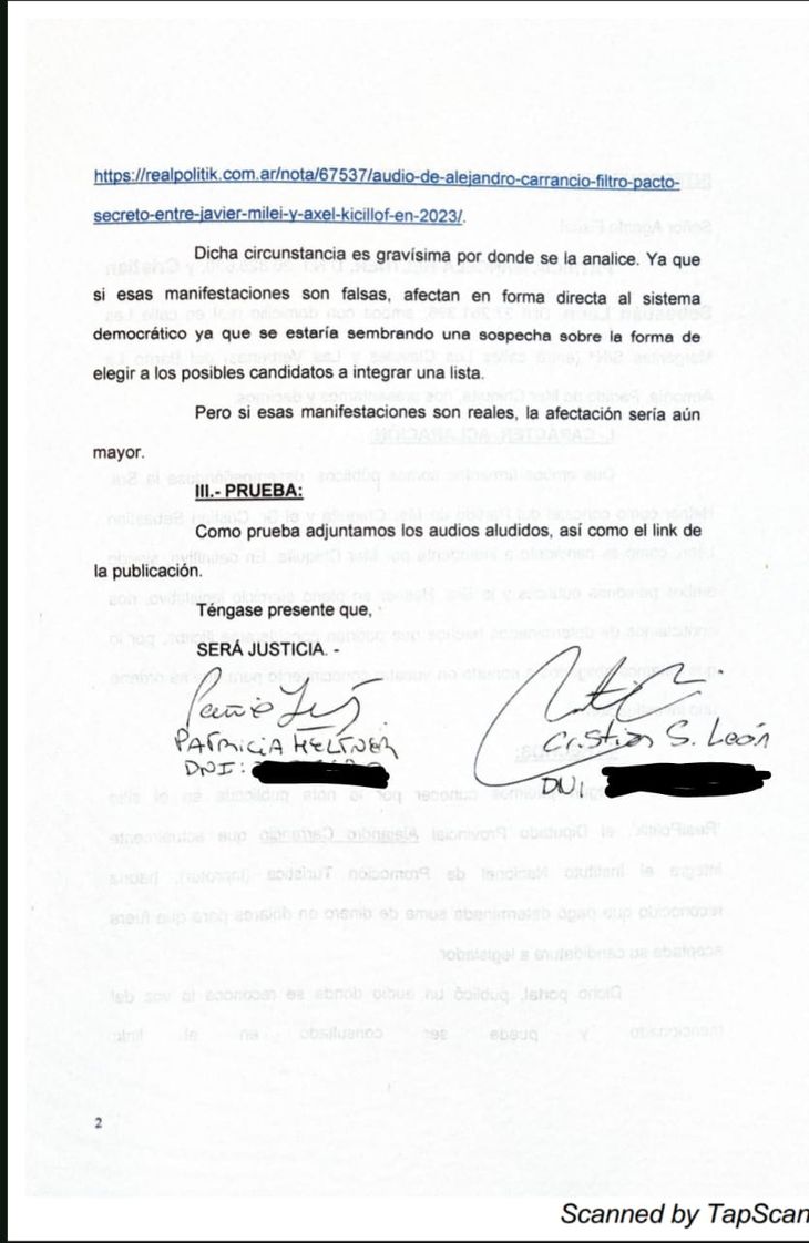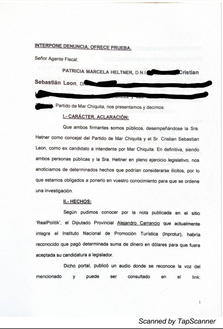 El excandidato a intendente por La Libertad Avanza en Mar Chiquita en el 2023, Cristian León, formalizó la denuncia en la mesa de entrada de la Fiscalía General junto a Patricia Heltner, presidenta del bloque libertario en el Concejo Deliberante municipal. En la presentación judicial, consignan que un dirigente llegó a un acuerdo con Carrancio y "habría reconocido que pagó determinada suma de dinero en dólares para que fuera aceptada su candidatura a legislador".