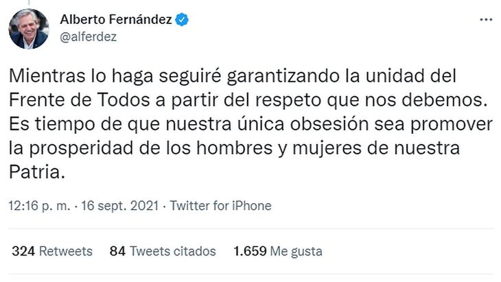 El presidente Alberto Fernández se refirió a los cruces al interior de la coalición del Frente de Todos, luego de que los ministros alineados con la vicepresidenta Cristina Fernández de Kirchner pusieran sus renuncias a su disposición tras el resultado electoral. Al respecto, el Jefe de Estado dijo: "La gestión de gobierno seguirá desarrollándose del modo que yo estime conveniente".