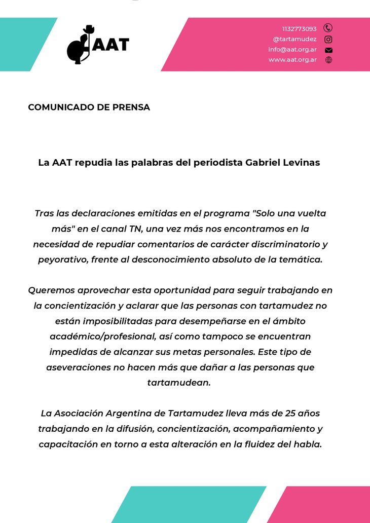 En primer ligar, llegó la reacción institucional a los comentarios. Fue la AAT, quien publicó un contundente comunicado este lunes, donde se hizo eco de lo ocurrido. Las opiniones del periodista generaron numerosos repudios en las redes sociales, entre ellos de personas con familiares con problemas de habla.