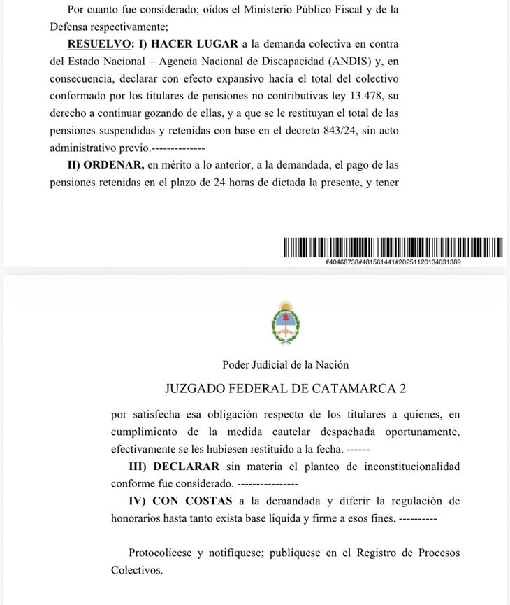 El Juzgado Federal Nº2 de Catamarca hizo lugar a una acción de amparo colectivo promovida por asociaciones de personas con discapacidad, titulares de pensiones no contributivas y el Defensor del Pueblo provincial, y ordenó a la Agencia Nacional de Discapacidad (ANDIS) restablecer todas las pensiones suspendidas sin acto administrativo previo. La medida se extiende a todo el país, según explicaron fuentes judiciales.