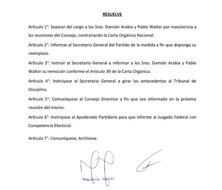 En una carta firmada por su presidente, Mauricio Macri, resolvieron "separar" del partido al diputado Damián Arabia y del exsenador Pablo Walter, ambos cercanos a la ministra de Seguridad Patricia Bullrich.