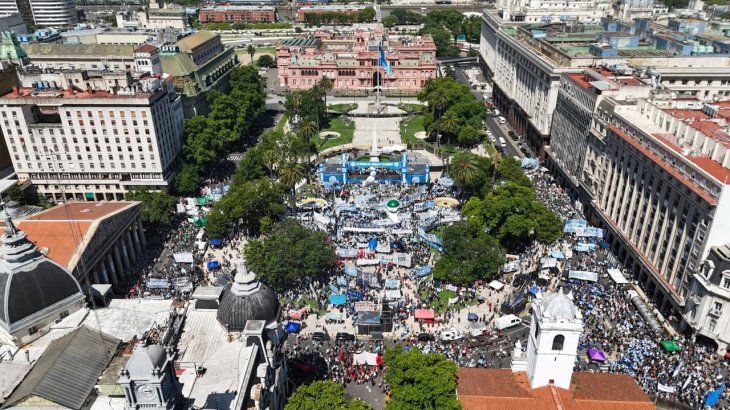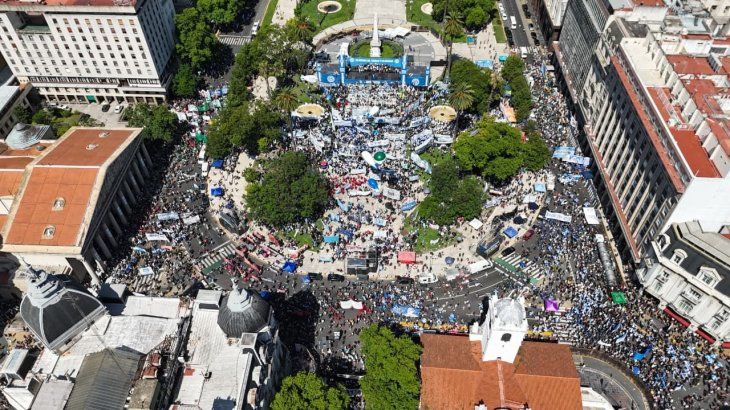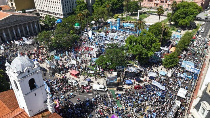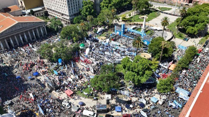 El epicentro fue Plaza de Mayo. Los líderes de la central obrera amenazaron con un paro nacional. El drone de Ámbito realizó tomas de la concentración.