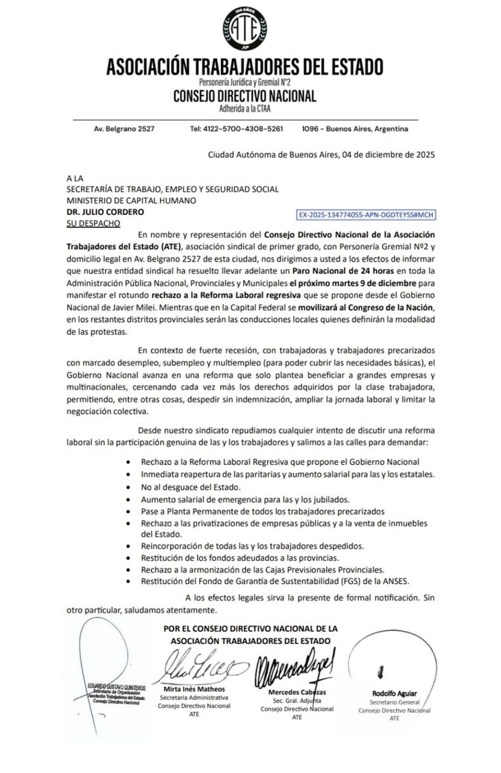 La Asociación Trabajadores del Estado (ATE) resolvió convocar a un Paro Nacional el 9 de diciembre, fecha en la que además se movilizará al Congreso. El sindicato adelantó que la jornada de protesta tendrá como ejes el rechazo a la reforma laboral impulsada por el Gobierno, la exigencia de reapertura de paritarias y la oposición al recorte del 10% de los trabajadores estatales.