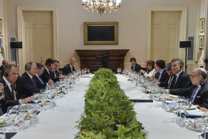 Finalizada la cena, ambos mandatarios brindaron una declaración en el Salón Blanco en donde el mandatario argentino calificó como "muy productiva" la reunión con su par ruso. "Compartimos un compromiso por el multilateralismo, contra el narcotráfico, el crimen organizado y el terrorismo", sostuvo Macri.