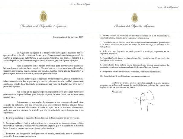 Mediante una carta que hizo llegar a cada uno de los convocados, el presidente Mauricio Macri invitó a los referentes de la oposición y de otros sectores sociales a "dar una muestra de acuerdo" sobre los diez puntos que el Gobierno considera "imprescindibles para despejar" algunas dudas que existen sobre la Argentina en el marco del proceso electoral.