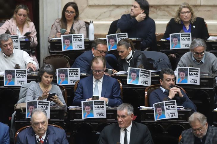 En la sesión especial de la Cámara de Diputados por la ley Bases y el paquete fiscal, los legisladores nacionales se sumaron al pedido de aparición con vida de Loan peña, el niño desaparecido hace 14 días en Corrientes. Los diputados aparecieron con carteles en las bancas con la consigna "Buscamos a Loan Danilo Peña".
