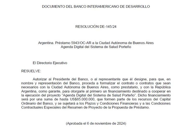 El financiamiento, solicitado por Macri y preaprobado por el BID en noviembre del 2024, tiene como destino la ejecución del proyecto “Agenda Digital del Sistema de Salud Porteño” que impulsa el Ministerio de Salud de CABA, a cargo de Fernán Quirós, y que tiene como objetivo “contribuir a mejorar el acceso oportuno, integral y continuo a los servicios públicos de salud de CABA”, según indica el informe del organismo multilateral.