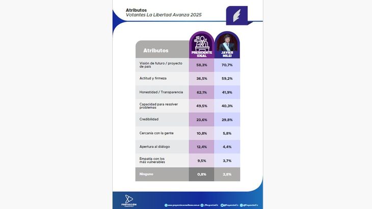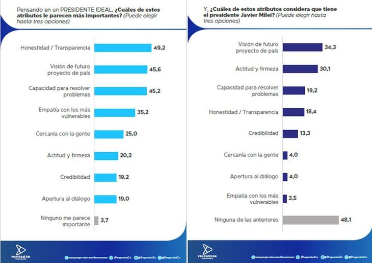 Al pensar en un mandatario ideal, el informe realizado por Proyección Consultores muestra que los argentinos priorizan atributos clásicos de la política moderna. La "Honestidad y la Transparencia" encabezan el ranking (49,2%), seguidas muy de cerca por "Visión de futuro y proyecto de país" con el 45,6% y la capacidad para resolver problemas continua con el 45,2%. En otro escalón aparecen la "Empatía con los más vulnerables" (35,2%) y "Cercanía con la gente" (25%), mientras que la apertura al diálogo, la credibilidad y la actitud y firmeza quedan algo más relegadas.