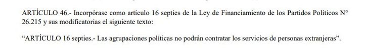Frente a ello, uno de los puntos que promete generar discusión tiene que ver con una cláusula que apunta a restringir la incorporación de extranjeros a la campaña a cambio de una contraprestación. El artículo 46 incorpora como "artículo 16 septies" el siguiente texto: "Las agrupaciones políticas no podrán contratar los servicios de personas extranjeras”.