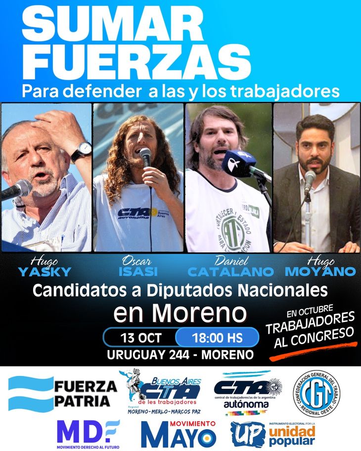 Los sindicatos ya confirmaron un acto en Moreno para el 13 de octubre con la consigna de "Sumar fuerzas para defender a las y los trabajadores", donde hablarán tres de los candidatos a diputados nacionales Hugo Yasky (CTA de los Trabajadores), Hugo Moyano hijo (CGT) y Oscar Isasi (CTA Autónoma). Antes podría haber uno en Cañuelas donde participen bancarios y Smata y podría contar con la presencia del gobernador bonaerense. También se prepara otro para el 7 de octubre en Mar del Plata. Ambos a confirmar.