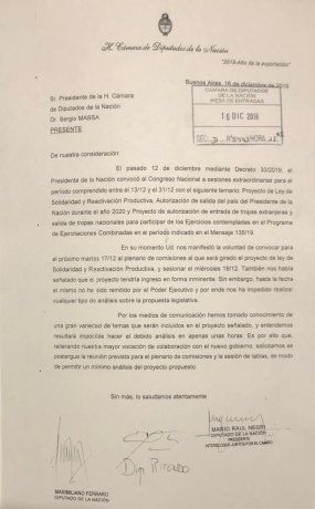 "En su momento usted nos manifestó la voluntad de convocar para el martes al plenario de comisiones para tratar el proyecto de Solidaridad Social y sesionar el miércoles 18. También nos había señalado que el proyecto tendría ingreso en forma inminente", dice el texto.