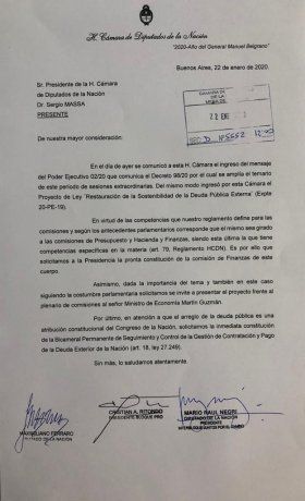Por último, los tres dirigentes solicitaron "la inmediata constitución de la Bicameral Permanente de Seguimiento y Control de la Gestión de Contratación y Pago de la Deuda Exterior de la Nación".