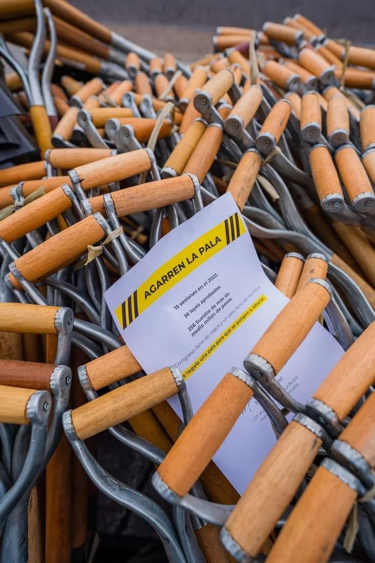 El conjunto de palas estaban acompañadas por un folleto donde el joven que se adjudicó la autoría del hecho, Mauro Stendel, les pidió a los legisladores "que se pongan a laburar": “Agarren la pala. 15 sesiones en el 2022. 36 leyes aprobadas. 256 sueldos de más de medio millón de pesos. Un Congreso lleno de vagos y un país lleno de hambre. Les regalo una pala para que se pongan a laburar”.