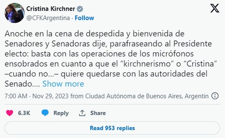 "Anoche en la cena de despedida y bienvenida de Senadores y Senadoras dije, parafraseando al Presidente electo: basta con las operaciones de los micrófonos ensobrados en cuanto a que el “kirchnerismo” o “Cristina” –cuando no…– quiere quedarse con las autoridades del Senado".