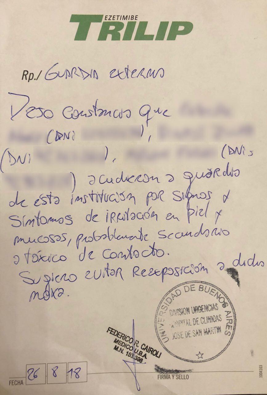En el certificado emitido el sábado pasado en el Hospital de Clínicas, se informa que la persona atendida concurrió a ser atendida con "síntomas de irritación en piel y mucosas". El facultativo que firmó el certificado se refirió a la probable exposición a un "tóxico de contacto". Y sugirió "evitar" esa exposición.