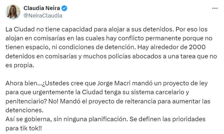 Neira, en un posteo en sus redes sociales se preguntó: "Ahora bien...¿Ustedes creen que Jorge Macri mandó un proyecto de ley para que urgentemente la Ciudad tenga su sistema carcelario y penitenciario? No! Mandó el proyecto de reiterancia para aumentar las detenciones. Así se gobierna, sin ninguna planificación. Se definen las prioridades para tik tok", aseguró la legisladora porteña.