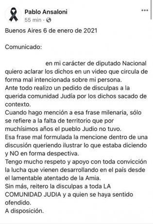 El diputado Pablo Ansaloni difundió este miércoles un comunicado vía Facebook para disculparse y aclarar sus declaraciones sobre la comunidad judía que fueron ampliamente repudiadas.
