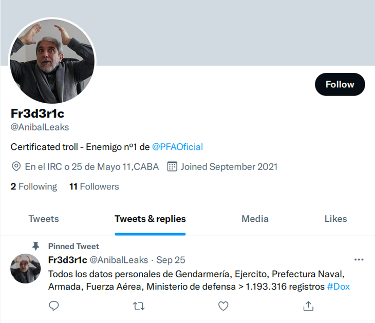 Además, indicó que desde esa misma cuenta -@aniballeaks, ahora suspendida- se habían publicado semanas atrás los datos de más de 1 millón de personas de la obra social de las fuerzas armadas (IOSFA).