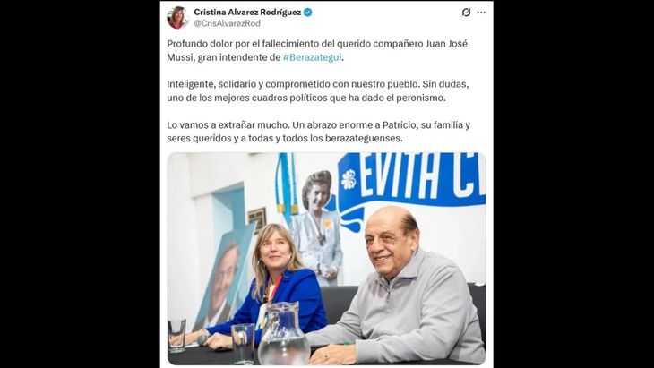 La jefa de asesores del gobernador bonaerense, Cristina Álvarez Rodríguez, también expresó su pesar por el fallecimiento del intendente. "Profundo dolor por el fallecimiento del querido compañero Juan José Mussi, gran intendente de Berazategui", apuntó.
