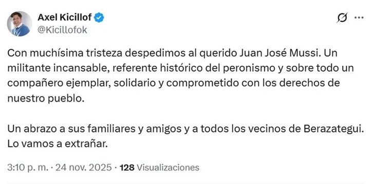 "Con muchísima tristeza despedimos al querido Juan José Mussi", expresó por su parte Kicillof, quien calificó a Mussi como un "militante incansable, referente histórico del peronismo y sobre todo un compañero ejemplar, solidario y comprometido con los derechos de nuestro pueblo". "Un abrazo a sus familiares y amigos y a todos los vecinos de Berazategui. Lo vamos a extrañar", cerró.