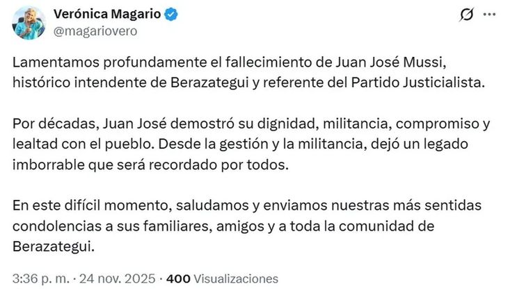 Verónica Magario, vicegobernadora de la PBA y legisladora electa, también expresó su tristeza por la muerte del mandatario comunal. "Lamentamos profundamente el fallecimiento de Juan José Mussi, histórico intendente de Berazategui y referente del Partido Justicialista", manifestó.